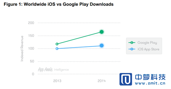 谷歌的安卓系统虽然不如苹果的iOS盈收高,但它下载量的增加却远超苹果。2014年,Google Play在线应用程序商店全世界的下载量比iOS App Store应用程序商店要多60%,根据全球知名应用分析商AppAnnie的最新报告显示。