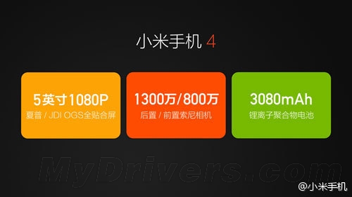 据了解,小米4手机提供黑、白两种颜色,采用高通骁龙801平台,3GB内存,号称“全球最快”的手机;采用5英寸1080P屏幕;配备1300万+800万的前后置摄像头,支持弱光拍照;电池容量为3080mAh,支持快速充电功能;支持家电产品的遥控功能。