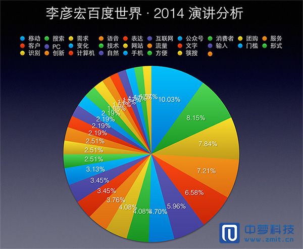 说明:我们主要提炼了演讲中的名词,根据出现频率进行简单的二次分析,主要提取与百度公司战略、业务相关的词汇。饼图,仅提取出现超过 5 次的名词。