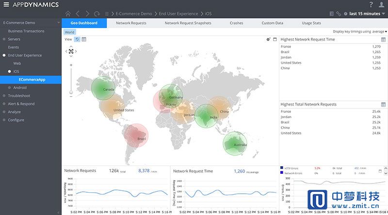 AppDynamics平台提供实时分析监控,洞察到世界各地的iOS、Android移动应用程序的性能。通过连续的监测设备类型,运营商,地区和更多的数据,为开发者提供终端到终端的服务,主动识别并解决性能瓶颈,提升移动终端用户体验。
