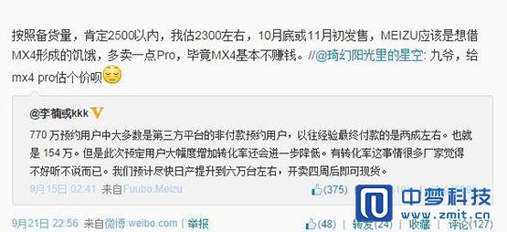 尽管魅族MX4的预订数量表现抢眼,但还是有不少用户在翘首期待旗舰版的MX4 Pro,尤其是有关该机的售价及上市时间更是成为了关注的焦点。日前,根据业内人士潘九堂在微博上的爆料称,魅族MX4 Pro售价将在2500元以内,估计在2300元左右,至于上市时间则预计在10月底或11月初。