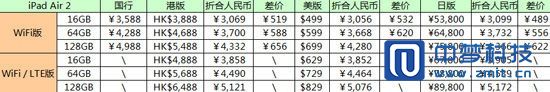 售价方面,国行目前仅有WiFi版支持预约,起售价格为3588元,港版折合人民币为3069元起售,美版折合人民币为3056元起售,日版折合人民币为3099元起售。总体上来看,国行版比其他三个版本价格高出约500元,考虑港版的可以在大陆保修和运费等,目前来看,港版iPad Air 2性价比最高。