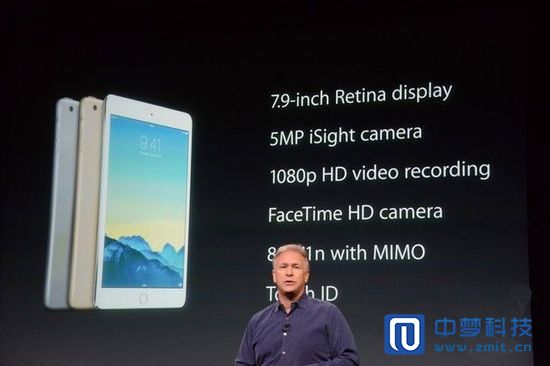 苹果在发布上也推出了升级版的iPad mini 3,外观上与前一代区别不大,同样是7.9英寸2048*1536像素分辨率屏幕,屏幕精细度达到326ppi,三围尺寸达到了200*134.7*7.5mm,WiFi版重量为331g,WiFi+LTE版为341g。内存版本和颜色与iPad Air 2相同。