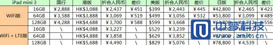 售价方面,国行版由于入网许可原因暂无LTE版本,目前仅有WiFi版支持预约,起售价格为2888元,港版折合人民币为2437元起售,美版折合人民币为2443元起售,日版折合人民币为2465元起售。总体上来看,国行版比其他三个版本价格高出400多元,考虑港版的可以在大陆保修和运费等,目前来看,港版iPad mini 3性价比最高。