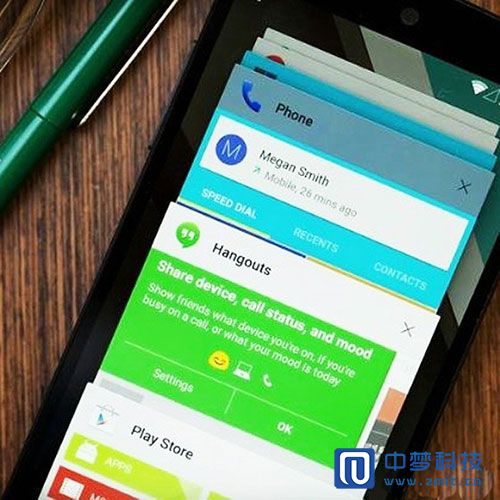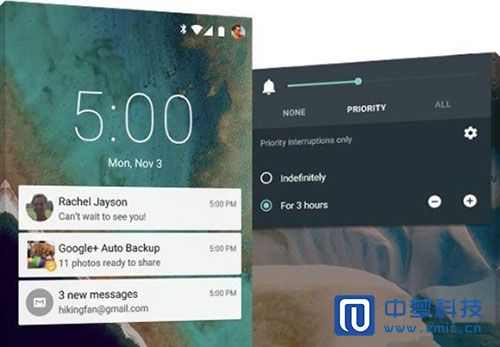 Android 5.0 Lollipop通知中心融入更多的卡片式风格,即使是在锁屏状态下也可以进行多种功能操作。同时用户可以自定义通知的优先级 别,使得用户不会错过任何重要的通知。还可以设置特定的通知权限,只有被允许的通知消息才会推送。同时还具有操作性,比如用户在游戏时有电话打入,不会以全屏显示,而是弹出可操作的通知卡片,用户可选择接听或拒接,不影响游戏继续进行。