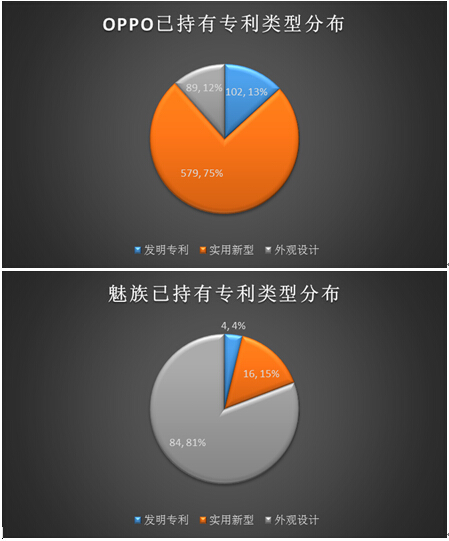 通过上述两图可以看到,在已获得的授权专利中,在发明专利、实用新型、外观设计上的布局,OPPO的比例依序为:13%、75%、12%,而魅族的比例依序为4%、15%、81%。