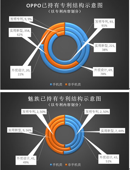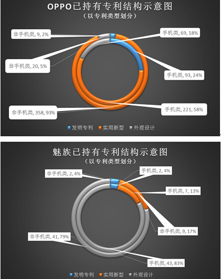 显然,OPPO已持有授权专利中,手机类的发明专利和手机类的外观设计专利比重均大幅高于魅族。