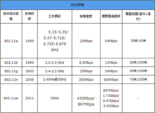 为了解决2.4G的频段拥挤问题,更高频率和更高带宽的IEEE 802.11n技术出现。802.11n能工作在5G频段,高频段拥有更高的带宽容量,同时不容易被干扰,设备相对2.4G少很多。802.11n便能够 解决信道拥挤和带宽不足的情况,其信道带宽能够到达40MHz,可以通过MIMO多路输入输出标准,采用多条天线叠加提高传输速度。一般的家用 802.11n设备能做到300-450Mbps的峰值速度,这也是用户经常看见销售的路由器标识显示速度300Mpbs的原因。虽然802.11n拥有 不俗的性能,但是缺点同样存在,高频段衰减大,覆盖范围比较小,一般家庭使用还可以满足需求,而大型办公场地的覆盖对比802.11b/g的2.4G频段 便显得优势不足。