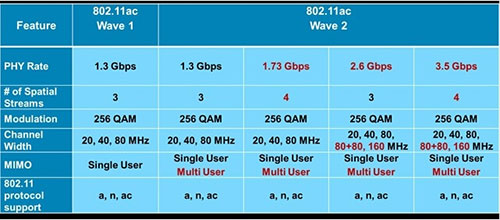 然而在目前推出的第二波802.11ac无线路由器中,7Gbps的最高速还远未达到,但时下顶级无线路由的理论最高速度达到1.7Gbps,并在实测中表现出接近千兆传输速率的潜力。不仅如此,搭载第二波802.11ac标准后,设备可拓展为包括80MHz和160MHz宽的频道、245-QAM调幅以及理论上的4x4客户端和8x8无线接入点。