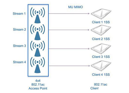 更值得一提的是,对于支持第二波802.11ac的设备来说,其中MU-MIMO(多用户、多输入多输出)技术的引入和实现,可以让无线路由器同时与多个客户端进行通信,这样不仅降低了延时,还提升了无线频段的使用效率,增加了无线局域网的密度。因为目前的手机终端都是采用一条无线流进行通信的,但在部署了MU-MIMO技术的第二波802.11ac设备间,则可以同时与多个终端设备进行多条流的通信,令整个无线网络的吞吐量性能,得到更大的释放。