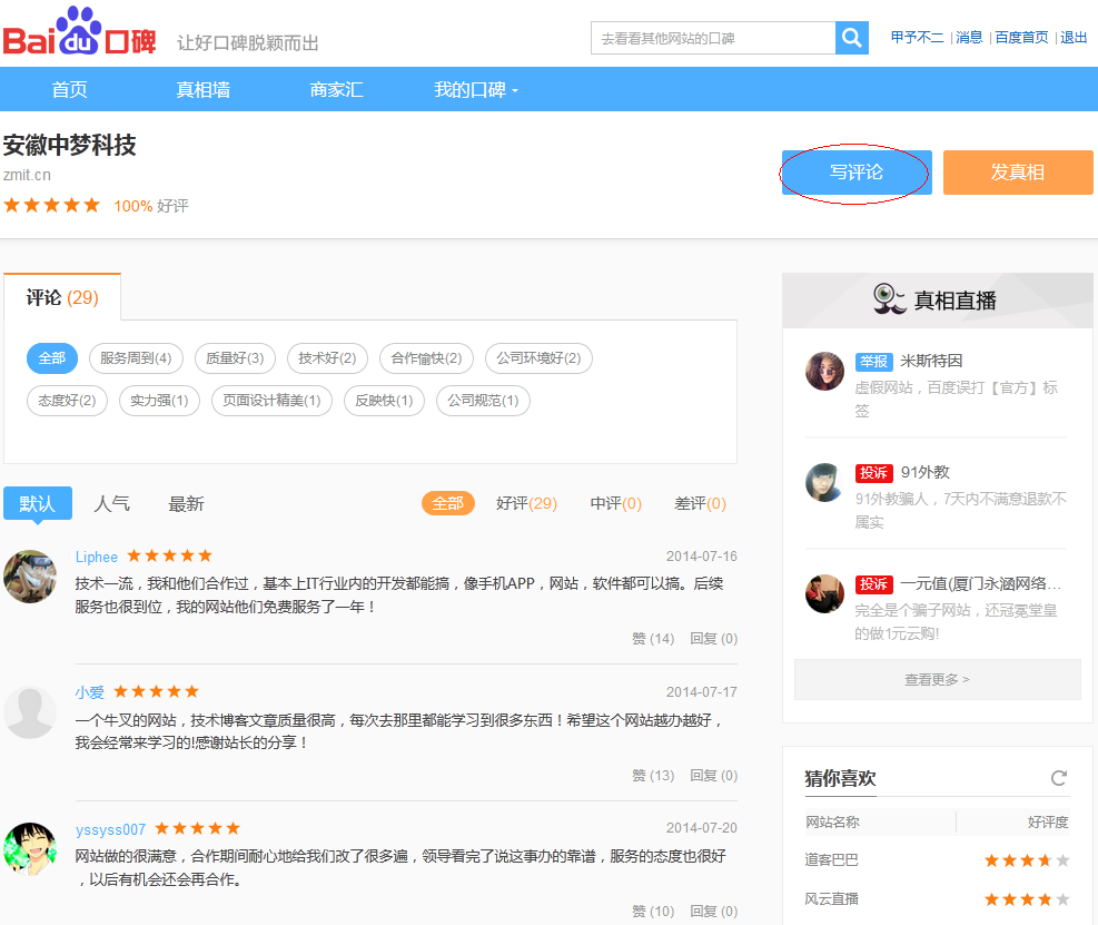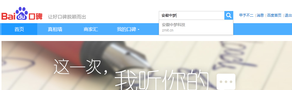 1、直接进入百度口碑网站(koubei.baidu.com),然后搜索安徽中梦科技或者直接输入网址www.zmit.cn 就可以对安徽中梦科技进行口碑点评了,如下图所示: