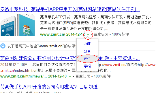 比如我们要查看安徽中梦科技的百度口碑,那么可以先在百度搜索“安徽中梦科技”或者直接输入网址“www.zmit.cn”,然后点击搜索结果的百度快照左侧的小箭头,然后选择“评价”即可快速进入该网站的百度口碑界面,如下如所示:
