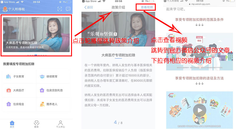 如果要了解相应政策详情,可以在APP首页,点击轮播图对对应专项扣除及个税相应政策进行了解,还可以视频介绍哦。