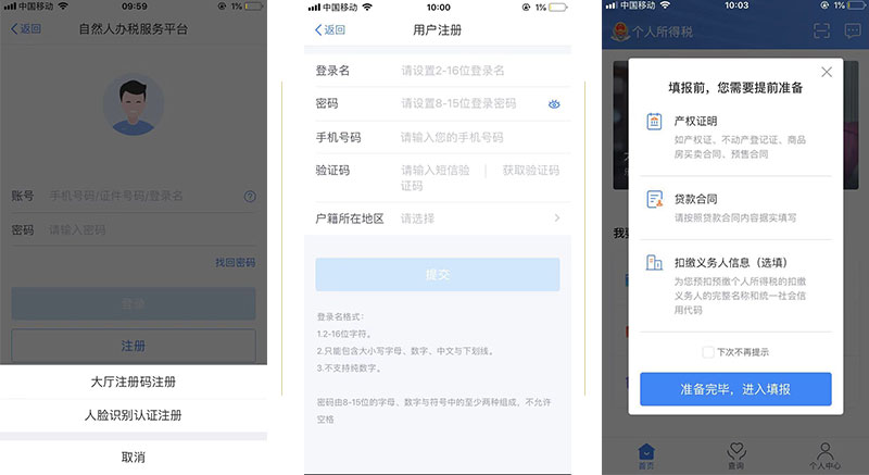 如果要办理相应的业务,点击轮播图底部”我要填报专项附加扣除“对应模块,即可,点击后会弹出办理相应模块的业务需要提前准备的资料,以免在填报的中途再找,耽误填报的时间,需要注意的是,首次填报需要进行注册,注册方式有两种,一种是注册码,需要去税务营业厅领取注册码后填写。另一种是人脸识别,与支付宝人脸识别相似。注册完成之后即可按要求办理相应的业务。