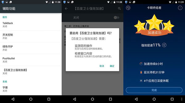 在实验了各种可能性之后,百度手机安全团队发现通过调用Android系统中的辅助功能可以达到自动“强行停止”的效果。所以,当你第一次使用百度手机卫士最新版的加速功能时,它会引导用户到辅助功能下面的【百度卫士强效加速】开启相关选项,这以后,用户只需要一次点击就可以实现手机加速了。当然,为了避免误杀,百度还针对应用做了分类,这样那些需要在后台运行的服务则依然可以继续运行,智能杀进程的目标自然也就实现了。