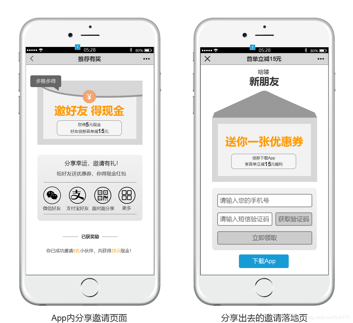 一种是分享邀请落地页,好友在该页面填写手机号+短信验证码,再下载App,使用同一手机号码注册App登录,后台通过落地页及App注册时上传的两次手机号码比对,就能绑定两者的邀请关系。