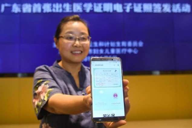 △2018年6月5日,在广州市妇女儿童医疗中心,市民殷彩欣展示儿子的出生医学证明电子证照。这是广东省第一张省内通用的出生医学证明电子证照。