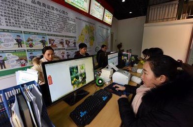 △江西省南丰县益农信息社工作人员在收集农产品信息(2018年2月5日摄)。