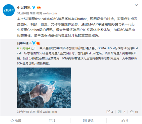中兴也表示,近日,中兴通讯助力中国移动在杭州成功打通了基于GSMA UP2.4标准的5G消息first call,标志着国内5G消息商用进入正式倒计时。