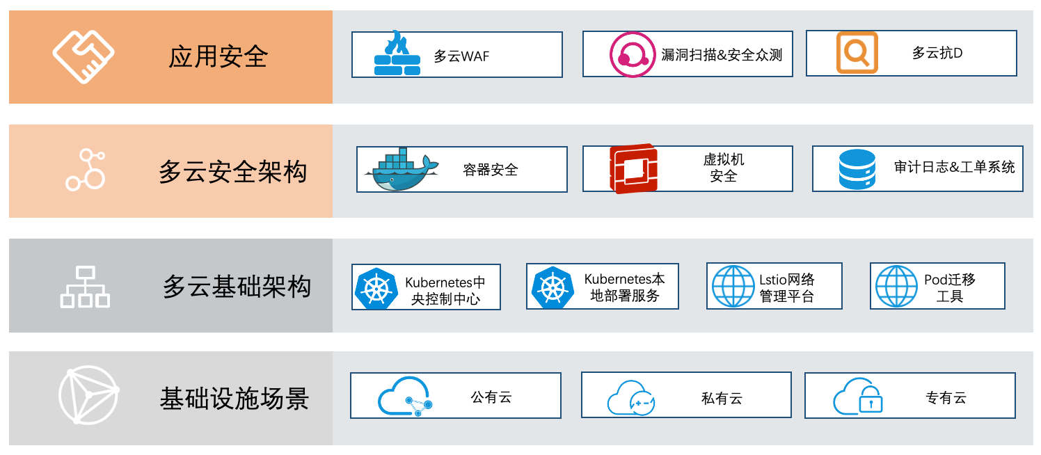 有了标准的多云基础架构,那么我们的安全基础架构就容易规划了。个人认为每家的多云管理系统差异化主要体现基础安全部分,应用安全部分可以使用多家产品。