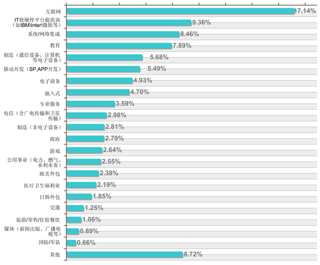除了互联网后端(服务器端)产品外,企业级应用(ERP/CRM/SCM/BPM等)和移动应用客户端也是开发者主要开发的产品类型,占比分别达到17.27%和14.01%。