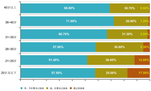 本次调查中,我们发现软件开发者在30岁以后,计划创业或已经创业的比例超过了40%。而在30岁以下,这一数字不超过33.3%。同时,数据显示,从业时间越长,计划创业或已经创业的比例越高,其中有10~15年工作经验的开发者创业意愿最强烈,占比超过50%。相对应,此阶段的开发者年龄都在35~36岁左右,已经积累了足够的经验,拥有技术优势、懂产品、懂趋势,进行创业的话,拥有了其他人不具备的优势,但“一将功成万骨枯”,成功者的背后倒下过多少人我们也需要在心中掂量掂量。