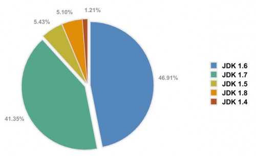 Oracle公司在3月18日发布了Java 8正式版,同期发布的还有JDK 1.8,新版JDK带来了不少新特性。但新技术在市场的普及仍需时日,调查结果显示,Java开发者中,目前使用最多的JDK版本是JDK1.6和JDK1.7,两个版本使用率为88.26%。
