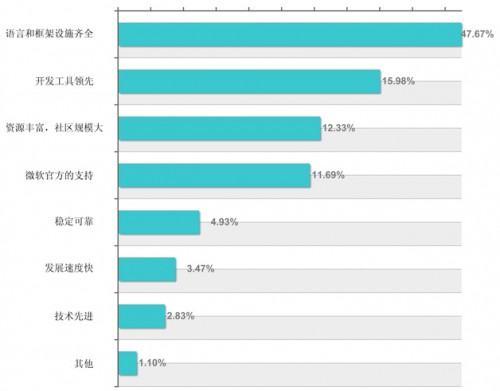 本次调查中,有23%的开发者表示从事.NET开发工作。其中82.56%开发者对.NET平台感到满意,语言和框架设施的齐全最令开发者满意,开发工具领先、资源丰富以及社区规模大、微软官方的支持等同样是.NET令开发者满意的因素。当然,.NET也有令开发者不满意的地方,如限定在Windows平台、性能资源耗用多等,其中限定在Windows平台的不满意率最高,达36.89%。
