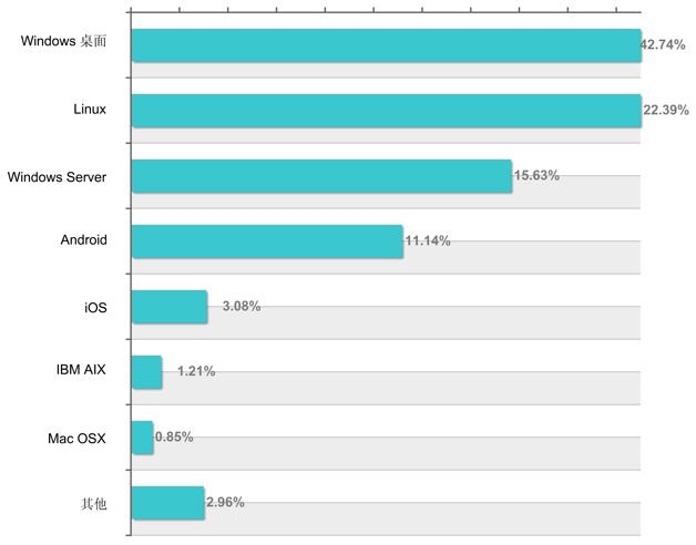 与此相应,调查中有42.74%软件开发者表示自己所开发的项目是面向Windows桌面操作系统,有15.63%软件开发者所开发项目主要面向Windows Server系统。除此之外,面向Linux系统开发项目的开发者有22.39%。同时,移动互联网市场发展迅速,面向Android及iOS操作系统进行项目开发的开发者分别占11.14%与3.08%。参调开发者中,也有部分Mac OS X系统项目的开发者,占比为0.85%。