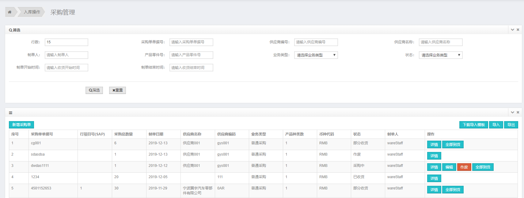 采购系统开单审批通过之后,同步至WMS生成对应的采购入库单。采购人员将采购清单导出发给供货商。