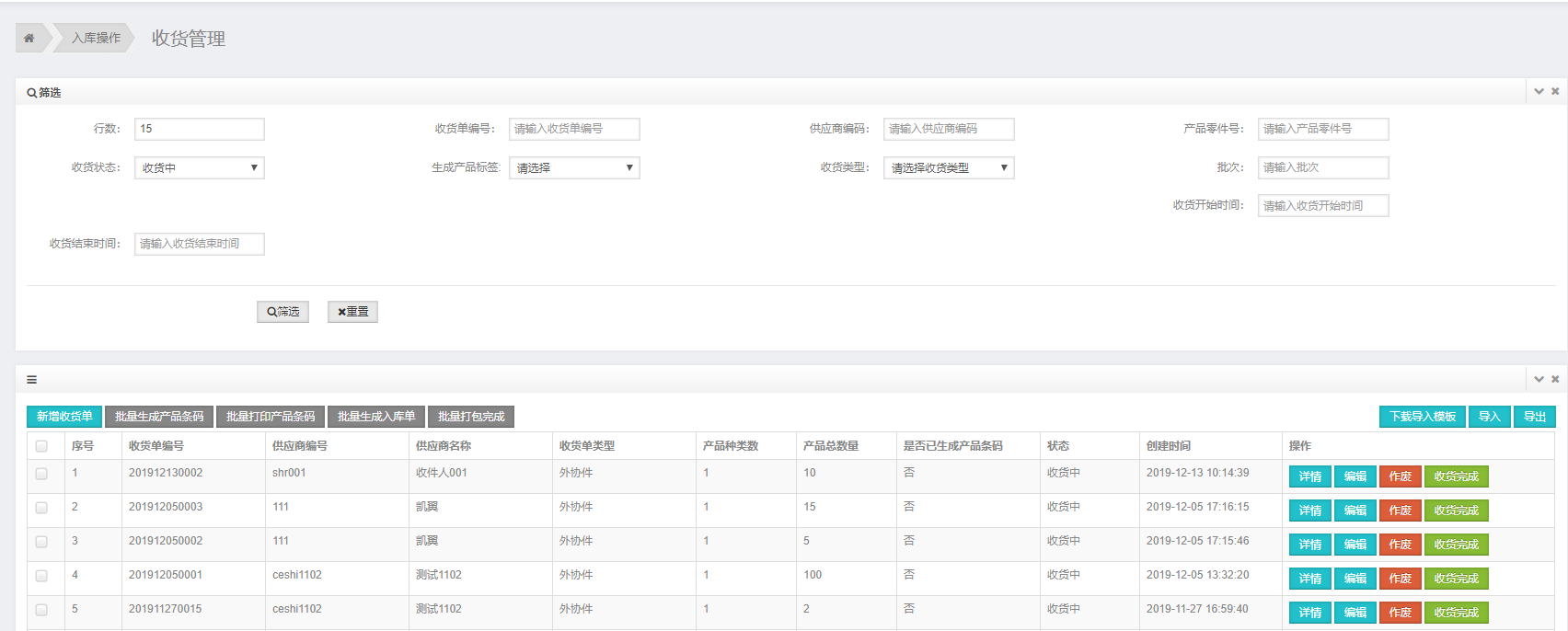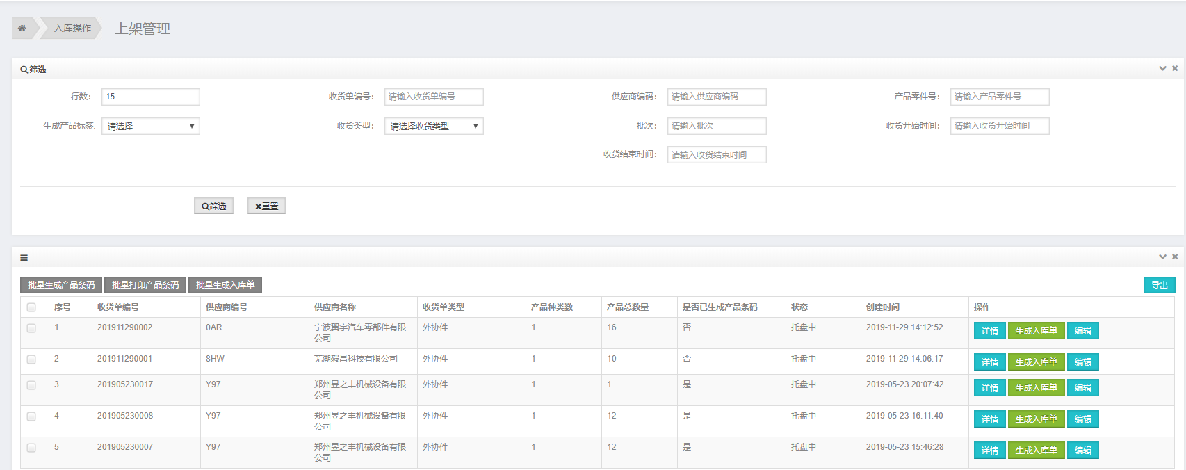 货品到达仓库后,仓储收货员根据采购单编号在WMS中找出对应的入库单,确认有该笔采购记录之后开始验货,一般货品数量较多的时候,通常是采用抽检的方式,工作人员清点货物,确认货物无误后将采购单转化为收货单,清点完货物后将状态设置为“收货完成”,系统将需要包装的产品转入包装环节,不需要包装的产品自动分配到上架入库管理。