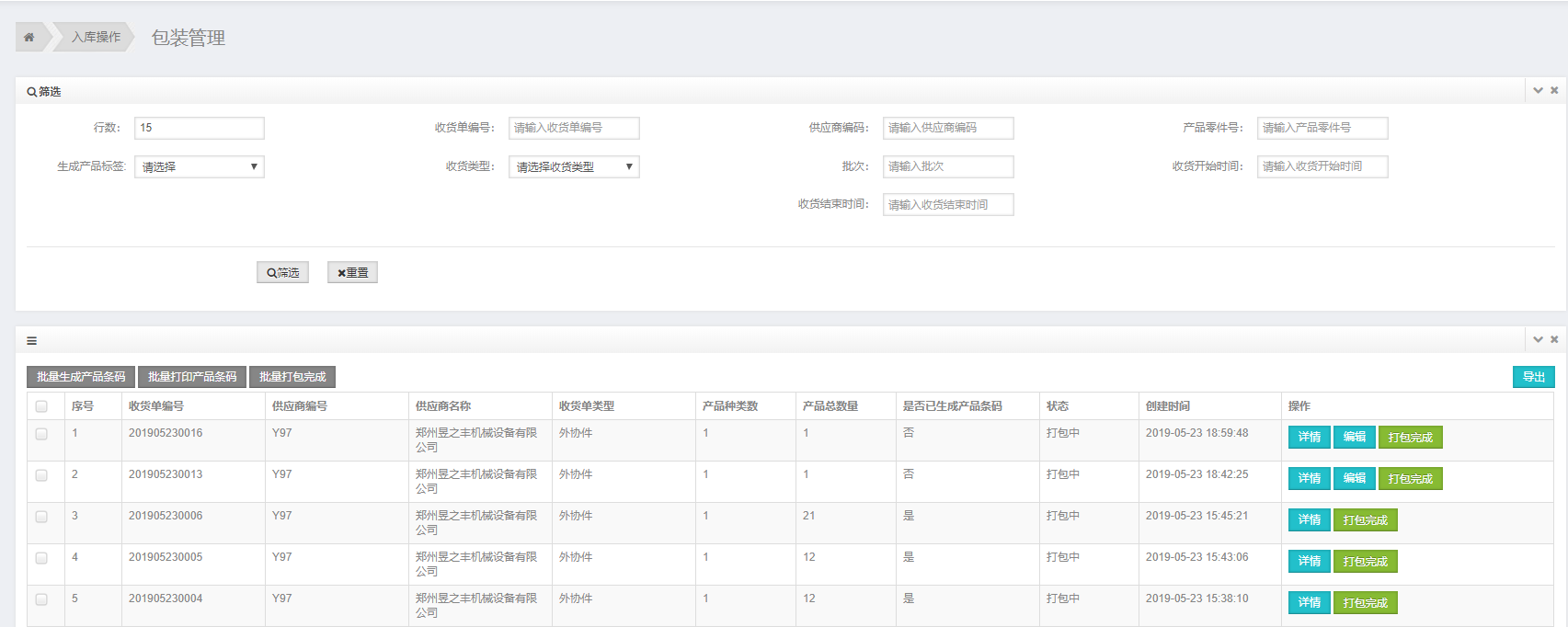 包装人员将需要包装的货品进行打包处理,对应商品根据产品基本信息的包装量进行包装,有需要调整的可以根据实际情况进行调整,包装完成后将状态设置为“打包完成”,系统将打包完成的货品转入上架入库管理。