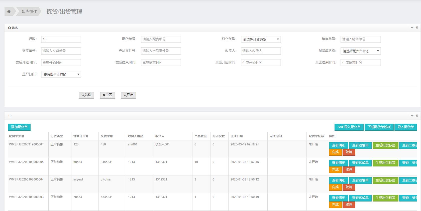 根据对应的销售单进行分拣货物,按设定的库位进行分配,将分拣的货物生成对应的拣货单,可以将分拣好的拣货单信息进行打印,分拣好的货物通过复核区进行复核,复核无误后可通过PDA手持终端扫商品条码完成出库,当出库完成后,系统便会自动更新好库存。